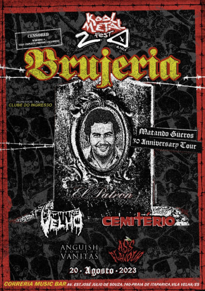Mais um Kool Metal Fest – 20 anos e mais uma vez com Brujeria! Além das edições paulista e as próximas em Belo Horizonte (MG) e Rio de Janeiro (RJ), o festival chega pela primeira vez a Vilha Velha (Espírito Santo). O Brujeria vai junto com o show especial de 30 anos do disco de estreia, o aniquilador Matando Güeros. O Kool Metal Fest – 20 anos também terá shows das bandas Anguish For The Vanitas, da local Ass Flavour, Velho e Cemitério.