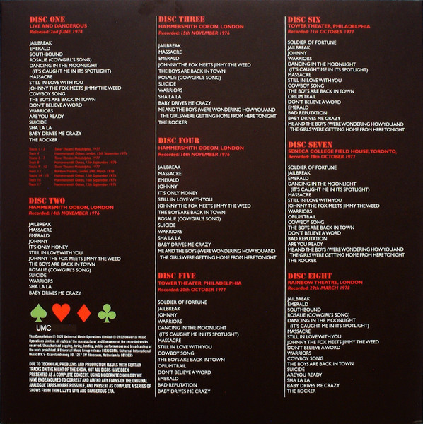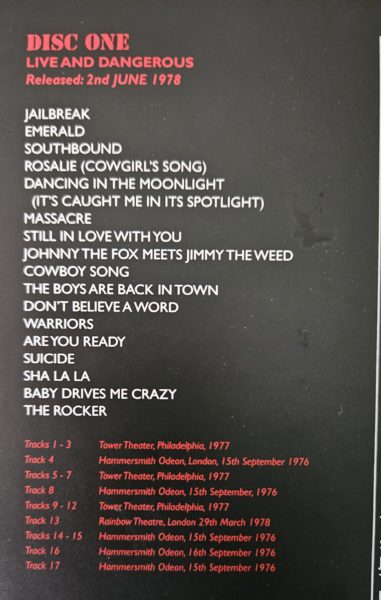 As duas apresentações no Tower Theatre (Philadelphia) e no Seneca College (em Toronto, Canadá) em outubro de 1977 foram extraídas da turnê de “Bad Reputation”, e as músicas deste álbum estão muito bem em suas versões ao vivo. Quanto ao show no Rainbow, o setlist é idêntico ao do álbum original; conforme consta do livreto da box, esse show foi realizado com o intuito específico de ser filmado, pois havia o plano de lançar a filmagem para acompanhar o álbum ao vivo original. Esses quatro shows permitem comparar a evolução do Lizzy em 1977 e 1978 com as gravações de 1976, mostrando que a banda não perdera nada do seu poder ao vivo, e ganhava com o novo repertório. Afinal, começar com uma quase balada como “Soldier of Fortune”, como fazem nos shows de 1977, não é para qualquer um.