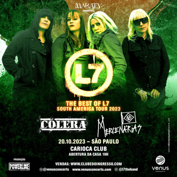 L7, banda pioneira do movimento feminista norte-americano no punk/grunge, volta ao Brasil para uma série de shows neste mês de outubro. O primeiro show foi em São Paulo, ontem, dia 20/10, no Carioca Club, em evento que ainda trouxe apresentações de Cólera e As Mercenárias. Belo Horizonte, 27/10 (MG), Ribeirão Preto, 22/10 (SP), Rio de Janeiro (RJ), Curitiba (PR) e Porto Alegre (RS) são outras cidades que recebem o L7 nesta turnê de Best Of, isso é, repertório só com clássicos da carreira. O L7 está de volta em plena atividade desde 2014, após um hiato de 14 anos. A banda se mostra revigorada e tocando ao redor do globo com explosivos shows sold-out. O quarteto de Los Angeles, à época comparada à versão feminina do Nirvana, foi uma das mais reverenciadas bandas no antológico Hollywood Rock de 1993, num show que até hoje é lembrado pela legião de fãs brasileiros.
