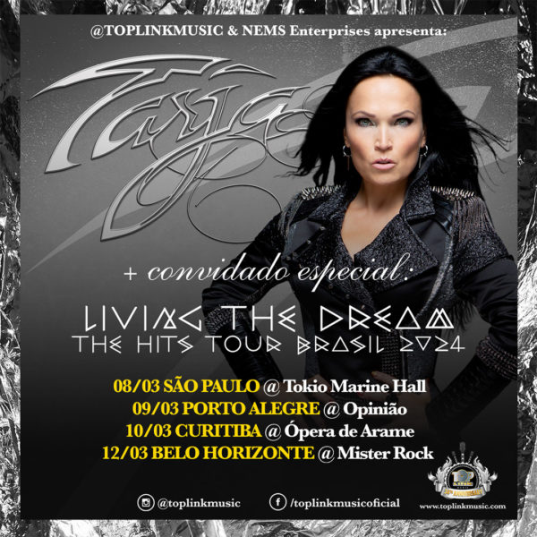 Após o grande sucesso da última passagem da cantora pelo país, artista anuncia novas datas. A cantora Tarja volta ao Brasil em março de 2024, para mais uma etapa da Living The Dream – The Hits Tour, que acabou de passar pelo país com shows lotados. Para as datas do próximo ano, ela contará com um convidado especial que será revelado mais a frente. A produtora Top Link Music, responsável pela turnê, realizou o anúncio oficial de todas as datas em suas redes sociais, confira a publicação.