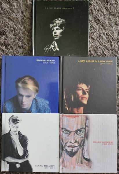 Até o momento, cinco boxes cobrem a carreira de Bowie de 1969 a 1988 e de 1992 a 2001, cada uma intitulada a partir de uma música da época: Five Years (1969-1973), Who Can I Be Now? (1974-1976), A New Career in a New Town (1977-1982), Loving the Alien (1983-1988)” e Brilliant Adventure (1992-2001), as duas primeiras com doze CDs, as demais, onze. As quatro primeiras foram lançadas entre 2015 e 2018, ao passo que a última em 2021. Agora vamos às caixinhas uma a uma, para destacar seus aspectos mais interessantes e vantagens.