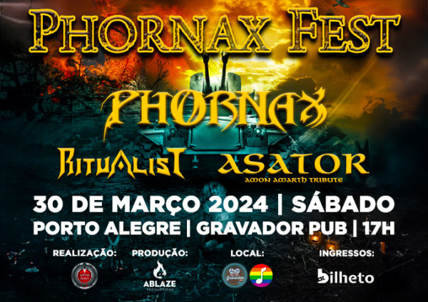 Porto Alegre receberá a primeira edição do Phornax Fest, com produção da empresa Ablaze Productions e do site Arena Heavy. Neste debut do evento tocará a banda anfitriã, PHORNAX, e as bandas Ritualist e Asator (Amon Amarth Cover). Com ingressos custando entre R$ 20,00 e R$ 40,00, o Phornax Fest terá início às 17h, na tradicional casa de shows Gravador Pub. Para Cristiano Poschi, vocalista do PHORNAX e CEO do Arena Heavy, trata-se não apenas de um festival, mas sim de uma movimentação maior na cena metálica da região: “Estamos dando início à uma nova ação em nome do cenário local, abrindo espaço para bandas de diversos estilos. Queremos movimentar o Metal gaúcho e criar possibilidades para todos, levando ao público o que há de melhor dentro do Heavy, Power, Thrash, Death, etc. Para isso, contamos com o apoio de todos neste projeto!”.
