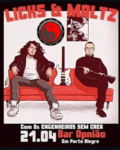 Fazia pelo menos trinta anos que o guitarrista Augusto Licks e o baterista Carlos Maltz não tocavam juntos no mesmo palco, desde a saída do primeiro da mais clássica formação do grupo gaúcho Engenheiros do Hawaii, conjunto que arrecadou milhares de fãs pelo país e (por que não?) pelo mundo. Um deles é o baixista/vocalista/tecladista Sandro Trindade, que desde 2016 mantém na ativa o tributo Engenheiros Sem CREA, tendo ao seu lado o guitarrista Jeff Gomes. O grupo de Sandro e Jeff chegou a tocar, em ocasiões separadas, tanto com Licks quanto com Maltz, até que surgiu a ideia de convidar os dois para tocarem ao mesmo tempo com o tributo de Sandro. Proposta aceita, o show de “reunião” de 2/3 da “formação GLM” dos Engenheiros foi anunciado em fevereiro deste ano, tendo data, hora e local marcados para acontecer: 21 de abril, às 20h, no Bar Opinião, em produção da Abstratti Produtora. Quando soube da notícia, comprei meu ingresso nas primeiras horas em que os mesmos foram disponibilizados, e fiquei quase dois meses na expectativa de um show que, eu sabia, seria histórico! Sou fã dos EngHaw desde minha adolescência (lá por 1986, 1987), mais precisamente, desde que ouvi “Toda Forma de Poder” na trilha sonora da novela Hipertensão, da Rede Globo. Cheguei a assistir ao grupo ao vivo na fase do disco ¡Tchau Radar!, já sem Licks e Maltz, e assisti Humberto Gessinger em carreira solo algumas vezes, em uma delas até com a presença de Carlos Maltz junto a si, na gravação do que resultaria no CD/DVD Ao Vivo Pra Caramba, A Revolta Dos Dândis 30 Anos (mas, nesta ocasião, o baterista apenas cantou e tocou percussão em uma única música – ainda que a mesma tenha sido repetida duas vezes naquela noite, por problemas técnicos na gravação). Mas ainda não havia assistido Augusto Licks, um dos melhores guitarristas do chamado BROCK, ao vivo sobre um palco, e havia, então, chegado a hora de corrigir esta “falha” no meu “currículo”.