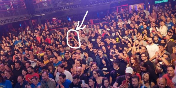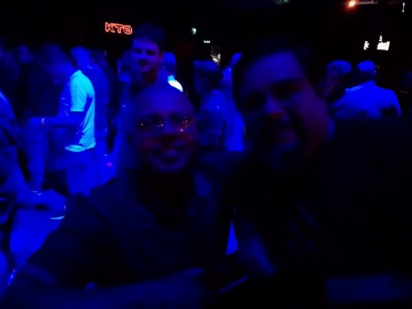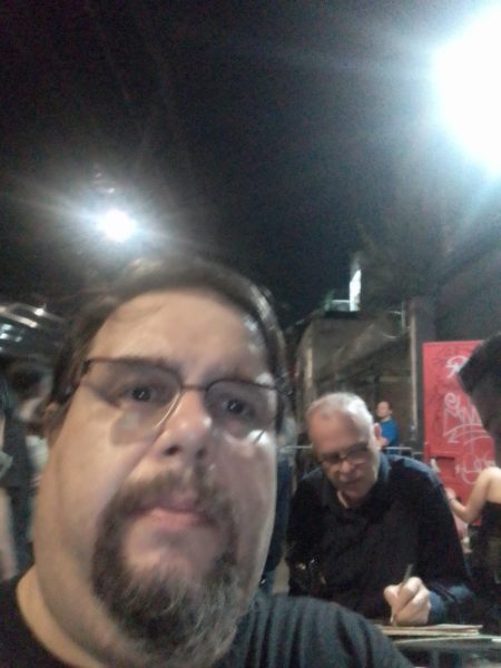Excelente também foi a organização do evento, com os portões abertos na hora marcada, permitindo às pessoas que estavam na fila (ainda em número pequeno perto de outras que já vi no local) que adentrassem confortavelmente no bar. A Abstratti separou o local em três setores (“pista vip”, “pista comum” e “mezanino”, algo que, devido ao tamanho do Opinião, sempre me parece algo bastante ridículo, pois a diferença entre um setor e outro não é tão significativa para justificar a diferença cobrada no preço dos valores entre os setores), e eu rumei para a pista comum, da qual tinha comprado ingresso. Pois foi com enorme surpresa que vi, passando ali pelo meio, o primeiro baixista dos Engenheiros, Marcelo Pitz, que circulava praticamente incógnito pelos poucos presentes que já estavam dentro do local. Confesso que não o reconheci de imediato, mas, alertado por alguém, logo o chamei e solicitei uma (hoje quase obrigatória) foto e seu autógrafo na capa do meu vinil de Longe Demais Das Capitais, único álbum da banda do qual ele participa. Ao lhe agradecer a atenção e disponibilidade, recebi de volta um “eu que agradeço a vocês, que ainda mantém a lembrança da gente com vocês!”! Achei muito bacana a atitude e a humildade de Pitz, além de sua imensa simpatia com aqueles que lhe abordaram!