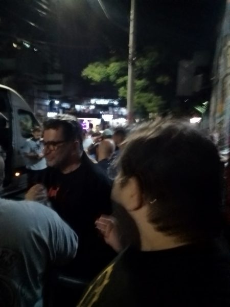 Foi com esta expectativa que rumei ao Opinião na tarde/noite de domingo, pronto para presenciar um reencontro que tinha tudo para nunca acontecer, se pensarmos na história dos envolvidos. Ainda antes de chegar ao local, um fato curioso: para quem não conhece o Opinião, o bar fica na esquina de duas ruas do bairro Cidade Baixa, na capital dos gaúchos. Pois em ambas as ruas que levavam ao local, no lado de fora mesmo, foram montadas as bancas de merchandising dos produtos do show, com copo (dez reais), pôster (vinte reais, e, “supostamente”, autografado pelos músicos) e camiseta (noventa reais – infelizmente, não tinha confecção do meu tamanho) disponíveis para os fãs que iam chegando e rumando para a fila, numa atitude que achei muito interessante, pois permitiu que, quem quisesse garantir sua “lembrança do show”, como anunciavam os vendedores, o fizesse sem precisar entrar na casa, enfrentar longas filas já no local do show, e ainda correr o risco de “perder o lugar” para ver ao show enquanto garantia seus itens. Excelente sacada da produtora (ou de quem foi o responsável pela ideia)!
