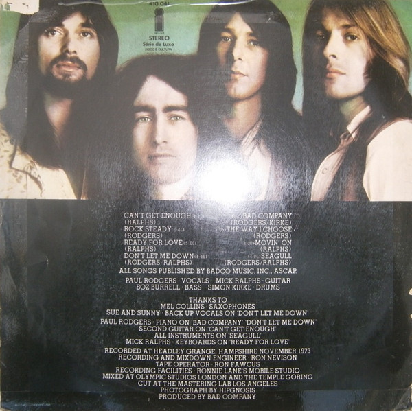 Em 24 de maio de 1974, um LP de capa preta com apenas cinco letras em cinza claro identificando o título – e o nome da banda – foi lançado na Inglaterra, marcando a estreia de um novo grupo. E que grupo! Bad Company era formado por Paul Rodgers (vocal, guitarra e piano), Simon Kirke (bateria e backing vocal), ambos ex-integrantes do Free, Mick Ralphs (guitarra, teclados e backing vocal), vindo do Mott The Hoople, e Boz Burrell (baixo e backing vocal), ex-King Crimson; quatro músicos que vinham de bandas bem-sucedidas e reconhecidas pelo público e a crítica. Mel Collins participa como convidado no sax e o duo Sue and Sunny contribui com backing vocals. Na capa interna do LP britânico, uma colagem de fotos da banda ao vivo – na americana, uma foto posada em estúdio que virou a contracapa do lançamento brasileiro em capa simples.