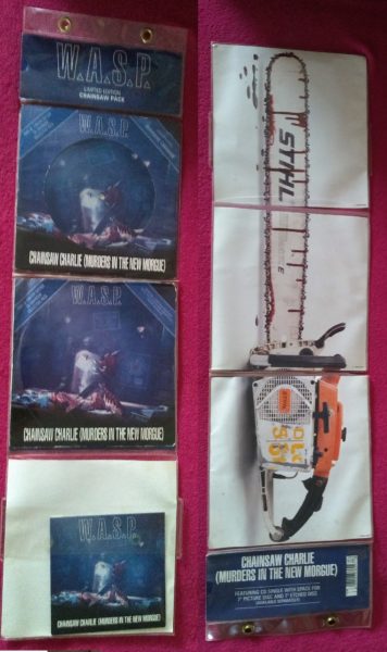 Para os colecionadores, o W. A. S. P. é uma banda que sempre traz novidades em seus lançamentos de singles, e não foi diferente com os da época de The Crimson Idol. O primeiro deles, de “Chainsaw Charlie (Murders in the New Morgue)”, saiu em uma tiragem limitada de um pacote contendo três mídias, chamada The Chainsaw Pack, assim como uma versão 12″. A The Chainsaw Pack é constituída de uma pasta plástica com 3 bolsas, uma para cada um dos lançamentos individuais, os quais foram: um compacto de 7″ Picture Disc; Um compacto de 7″ etched com uma mensagem gravada a mão no vinil, feita por Lawless; e o CD single. Como novidades musicais, temos “Phantoms In The Mirror” (presente na versão 12″, CD single e no 7″ etched) e a faixa “The Story Of Jonathan (Prologue To “The Crimson Idol”) Part 1″ (presente na versão 12″ e CD single), a qual narra a primeira parte da história presente no encarte que acompanha o Vinil e CD originais.