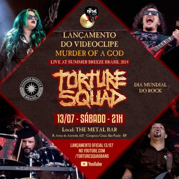 Torture Squad, uma das bandas mais renomadas do metal brasileiro, se prepara para lançar o videoclipe “Murder of a God – Live at Summer Breeze Brasil 2024”. Para celebrar o trabalho, a banda convida imprensa e fãs para o lançamento oficial, no dia 13 de julho, Dia do Rock, no The Metal Bar, em São Paulo, à partir das 21 horas. A faixa foi lançada originalmente em 1999 no álbum Asylum of Shadows. É considerada como o “embrião”, pois consolidou a fórmula de composição da banda, fincando o estilo musical e a marca Torture Squad.