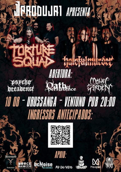 Hatefulmurder e Torture Squad, dois dos maiores nomes do metal nacional, irão levar uma calorosa apresentação para duas cidades de Santa Catarina. As apresentações acontecem no sábado, dia 10 de agosto no Ventuno Pub, com a presença das bandas Psycho Decandence, Oath of Persistence e Malice Garden. E no dia 11 de agosto no Célula Showcase com a presença das bandas Psycho Decandence, Oath of Persistence e Sempta. O show é uma realização da Produja1. Os ingressos já estão à venda através do site da Meaple – Compre AQUI.
