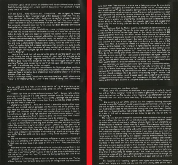 Ela passou a acreditar que eu era o diabo, e com os dias contados, ela me abandonou no orfanato The Sisters of Mercy Boys Home, quando eu tinha 8 anos. Suas últimas palavras para mim foram ‘Nunca discutirei com um diabo’. Fui oferecido ao sacrifício para os deuses pagães do vício. Saí das correntes de sua escravidão para um novo mundo de escravidão. Era um orfanato católico, e aquilo para mim era o inferno na Terra relatado na Bíblia. Era um complexo em parceria com o estado, com uma parte sendo o orfanato e outra sendo um hospital de doentes mentais. Não era permitido que as crianças fossem no hospital, mas existiam relatos de que algumas foram parar lá. Ninguém sabia se era verdade.