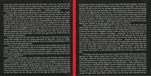 Os pais de Billy eram ricos, e mandavam muito dinheiro, o qual Billy convertia em qualquer coisa que quisesse, inclusive drogas, e ‘Spazmo’ era seu ‘serviçal’, recebendo valium, percodina, codeína e ecstasy, especialmente ‘X’. O lugar era um inferno, e a única maneira de sobreviver lá era ficar fodido todo o tempo. Contei minha história para eles, que me contaram que haviam outras duas crianças que contaram a mesma história que eu. Uma morreu misteriosamente e a outra cometeu suicídio por overdose. Passei dois anos lá em coma de ectasy auto-induzido, e ao menos não sentia dor. Foi então que soubemos que Sadie havia sido encontrada morta, e com isso, Ann Marie me mandou de volta para o orfanato. Agora ela estava no comando. Para comemorar, decidimos fazer uma festa.