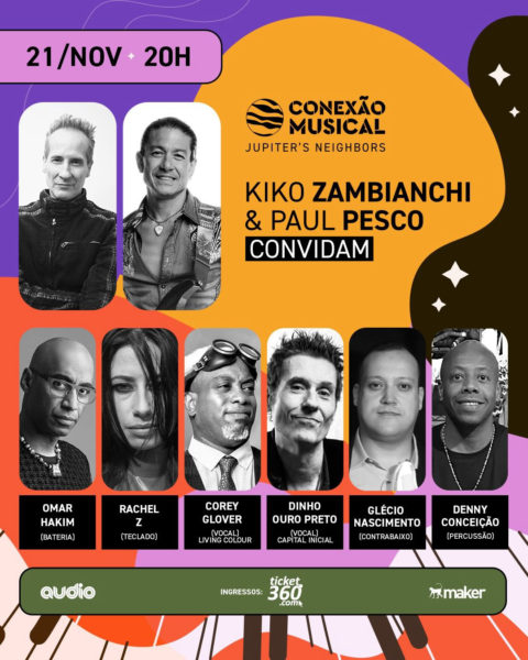 Em 21 de novembro, a capital paulista será palco da estreia do show “Jupiter’s Neighbors”, um encontro entre artistas nacionais e internacionais promovido pelos músicos Kiko Zambianchi e Paul Pesco, guitarrista norte-americano conhecido mundialmente por ter participado da turnê de estreia da Madonna, The Virgin Tour, e ter gravado com grandes nomes como George Benson, Jennifer Lopez e Alicia Keys. A primeira edição do projeto, que tem o intuito de viabilizar um intercâmbio entre artistas de vários países, contará com o lendário baterista Omar Hakim (David Bowie, Miles Davis, Dire Straits, Sting, Daft Punk e Madonna), a tecladista Rachel Z (Al Di Meola e Peter Gabriel) e o vocalista da banda Living Colour, Corey Glover. Se juntam ao time, os brasileiros Dinho Ouro Preto, vocalista do Capital Inicial, o contrabaixista Glécio Nascimento e o percussionista do Natiruts, Denny Conceição.