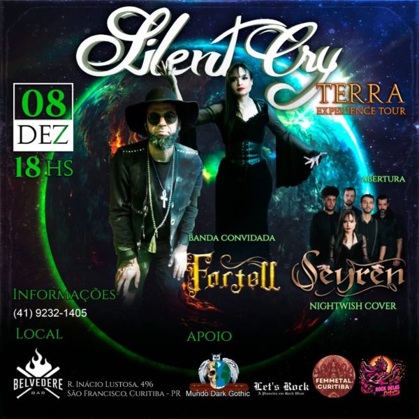 No próximo dia 8 de dezembro, o Belvedere Bar será o cenário de uma noite especial para os fãs de Metal Sinfônico, Dark e Doom Metal de Curitiba. A icônica banda mineira Silent Cry, que celebra 30 anos de trajetória, traz pela primeira vez ao Sul do Brasil sua turnê “Terra Experience Tour”, com destaque para a performance da vocalista Vanessa Rafaelly, cuja versatilidade vocal transita entre a intensidade do doom e a beleza melódica do sinfônico. Os ingressos estão disponíveis pela plataforma Sympla, por R$ 40 antecipado, mais taxas. No dia anterior, o grupo – também ao lado da Seyren – passa por Cascavel, com apresentação na Adega Nóstra-Vamos.