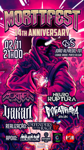 O MorttFest retorna em mais uma edição especial, comemorando os 14 anos de Mortticia e se consolidando como um dos eventos de destaque na cena rock e heavy metal de Porto Alegre. Idealizado e produzido pela banda, o festival tem como objetivo reunir e valorizar bandas parceiras que se destacam pela produção de música de alta qualidade no cenário do metal gaúcho e do sul do Brasil. Nesta edição, além da apresentação da banda anfitriã, o público terá o privilégio de assistir a shows de bandas renomadas da cena local, como Neuro Ruptura, representante do metal moderno; Boca Braba, trazendo todo o peso e presença do hardcore/crossover; e a presença especial da banda de prog power metal Vakan, diretamente de Santa Maria.