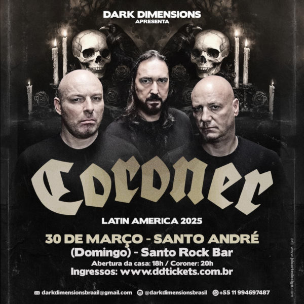 Uma das maiores referências do Thrash Metal técnico mundial, o Coroner retorna ao Brasil para um show exclusivo no dia 30 de março de 2025, domingo, no Santo Rock Bar, em Santo André/SP. Este evento, promovido pela Dark Dimensions, promete ser uma noite intensa e inesquecível para os fãs saudosistas do metal extremo. Formada em Zurique, Suíça, em 1983, a banda Coroner rapidamente se destacou pela combinação de agressividade thrash com uma abordagem técnica e progressiva única, consolidando sua reputação como uma das bandas mais inovadoras do gênero. Com álbuns clássicos como R.I.P. (1987), Punishment for Decadence (1988) e Mental Vortex (1991), o Coroner ganhou o status de “Rush do Thrash Metal” graças aos seus riffs complexos, arranjos intricados e solos técnicos.
