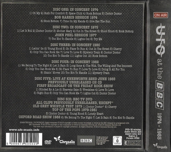 Estes boxes saíram entre 2011 e 2013, e ainda em 2013, a Chrysalis colocou mais uma caixinha no mercado. Batizada AT The BBC “ON AIR” 1974 – 1985, trata-se de um compilado de cinco CDs mais um DVD retomando o que algumas das principais participações do UFO em transmissões da famosa e tradicional rádio inglesa, entre os anos de 1974 e 1985, exatamente o período que a banda esteve na gravadora. Mas será que vale apena investir os seus suados tostões em mais uma caixa do UFO? É o que tento responder aqui.