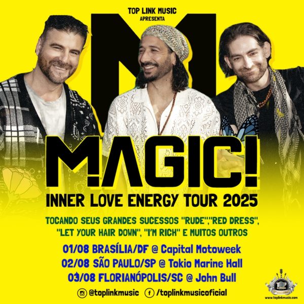 Uma das grandes sensações da música na atualidade, os canadenses do MAGIC! retornam ao Brasil em 2025 para uma turnê em grandes praças. O conjunto se apresenta no festival Capital Motoweek, em Brasília, no dia 01 de agosto; em São Paulo, no Tokio Marine Hall, dia 02 de agosto e encerra em Florianópolis no domingo, dia 03, no John Bull. O MAGIC! é uma banda canadense de fusão de reggae, fusion e pop, formada pelos integrantes originais Nasri Atweh (vocal e guitarra), Mark “Pelli” Pellizzer (guitarra e teclas), Ben Spivak (baixista). Narsi também atua como produtor e compositor. Já fez músicas para artistas como Justin Bieber, Shakira, Christina Aguilera, Lana Del Rey, e Vanessa Hudgens, entre muitos outros. Uma dessas é “Cut me Deep”, que rendeu uma parceria do Magic! com Shakira em um dos álbuns da cantora.