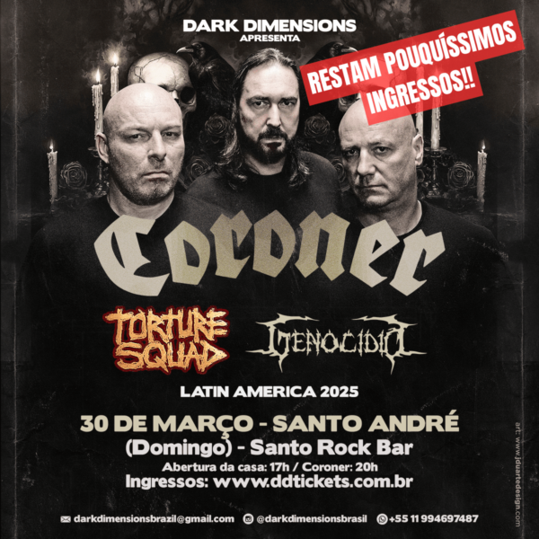 Um dos ícones do Thrash Metal técnico mundial, a lendária banda suíça Coroner está prestes a desembarcar em uma extensa turnê global em 2025 para comemorar suas quatro décadas de carreira. No Brasil, o grupo realizará um show único e exclusivo no dia 30 de março, domingo, no Santo Rock Bar, em Santo André/SP, como parte de uma turnê de seis shows pela América Latina organizada pela produtora Dark Dimensions. O evento contará com a presença das conceituadas bandas brasileiras Torture Squad e Genocídio como convidadas, prometendo uma noite ainda mais inesquecível para os fãs do metal pesado.