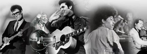 Heróis do rock nos anos 50: Buddy Holly, Bill Haley, Elvis Presley, Little Richard e Jerry Lee Lewis