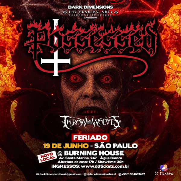 Informamos que, por motivos logísticos relacionados à equipe de gerenciamento dos voos da banda, o aguardado show do Possessed na capital de São Paulo foi reagendado para o dia 19 de junho (quinta-feira, feriado de Corpus Christi) e terá novo local: Burning House, na região da Água Branca. Devido à alteração, infelizmente não foi possível manter todas as bandas de abertura previamente anunciadas, permanecendo apenas a Throw Me To The Wolves. A nova data exigiu uma rápida adaptação e, dentro das possibilidades disponíveis de locais, a produtora conseguiu garantir o espaço da Burning House para a realização do evento à tempo. Importante ressaltar que a Produtora Dark Dimensions é responsável apenas pela produção do show em São Paulo, não tendo envolvimento com a logística da turnê.