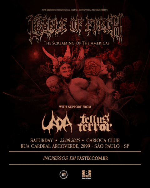 A instituição de metal extremo indicada ao Grammy, a banda inglesa Cradle of Filth retorna ao Brasil após sete anos para uma extensa turnê no mês de agosto em divulgação do 14º álbum de estúdio, The Screaming of the Valkyries. Serão três apresentações com realização local da ND Produções com a Agência Sobcontrole: 21/08 em Limeira/SP (Mirage), 22/08 em Curitiba/PR (Tork ‘n Roll) e dia 23/08 em São Paulo/SP (Carioca Club). Em todos os shows desta turnê, o Cradle of Filth terá como banda convidada a norte-americana Uada, com seu black metal repleto de elementos melódicos e densos.