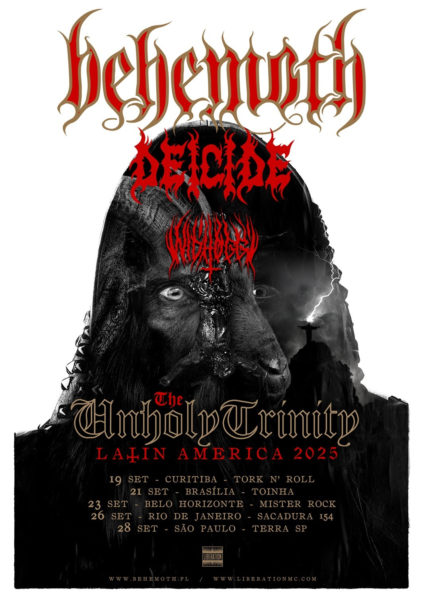 Behemoth, a mais poderosa e bem sucedida banda de black/death metal da atualidade, traz à América Latina, no próximo mês de setembro, a turnê The Unholy Trinity, etapa regional da grandiosa versão européia que os poloneses acabam de fazer na Europa. A realização é da Liberation Music Company. Promovendo o aclamado novo álbum do Behemoth, The Shit Ov God, a turnê terá como convidados especiais os titãs do death metal, Deicide (EUA), e a abertura da também polonesa, Nidhogg, nome em ascensão do black metal. No Brasil, os shows acontecem dia 19/09 em Curitiba (Tork n’ Roll), dia 21/09 em Brasília (Toinha), dia 23/09 em Belo Horizonte (Mister Rock), dia 26/09 no Rio de Janeiro (Sacadura 154) e em São Paulo, dia 28/09 (Terra SP).