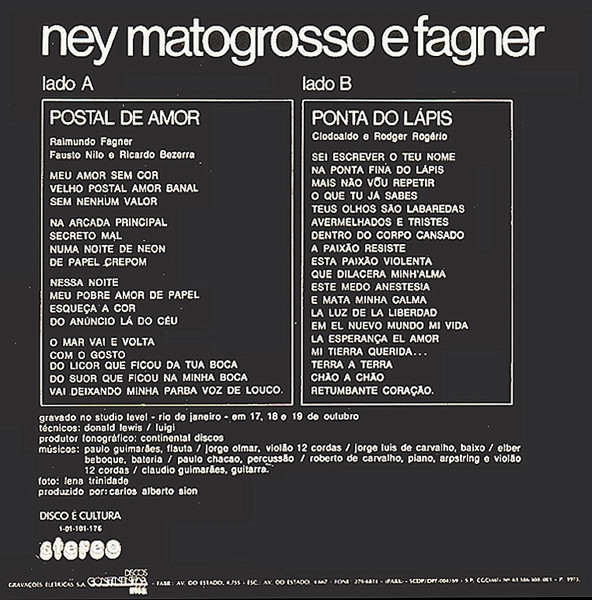 4. Parabéns pela resenha!!! Ótima!!! E não sabia desse festival!!!! Quanto ao excelente compacto, saiu como faixas bônus na bela reedição remasterizada do cd “Bandido” na excelente caixa “Ney Matogrosso Anos 70”, que tem os 6 álbuns solo dele na década. E vale ressaltar também que o Ney gravou as duas músicas no último álbum dele lançado em mídia física, o cd “Bloco na rua”.