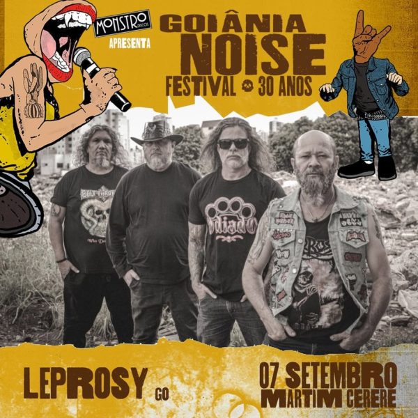 A turnê de divulgação de Reborn In Yourself, o mais recente e aclamado álbum do LEPROSY, ganha um novo e importante capítulo. A banda de Death Metal foi oficialmente confirmada no line-up do ‘Goiânia Noise Festival’, que celebra sua edição histórica de 30 anos. O grupo se apresentará no dia 07 de setembro, no Centro Cultural Martim Cererê, em Goiânia/GO, em uma noite que contará com outras atrações como União Clandestina, Dona Iracema, Teia, Budang, Mechanics e Ratos De Porão, lenda do Crossover mundial. Confira abaixo o serviço completo para mais informações: