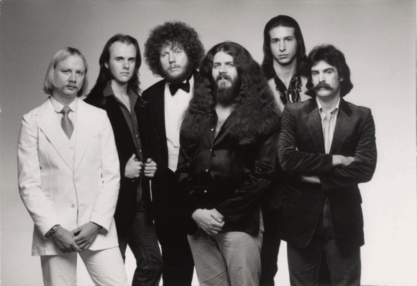 Kansas em 1977: Kerry Livgren, Phil Ehart, Rich Williams, Bobby Steinhardt, Steve Walsh e Dave Hope (da esquerda para direita)
