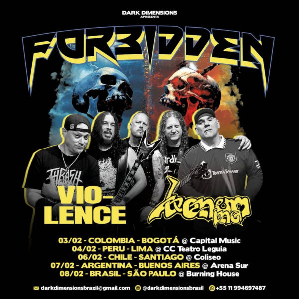 A produtora Dark Dimensions orgulhosamente anuncia uma turnê inédita pela América do Sul que reunirá em 2026 três nomes importantíssimos do metal e do thrash metal mundial: Forbidden, Vio-Lence e Venom Inc. Serão cinco datas confirmadas em países-chave da região, passando por Brasil, Argentina, Chile, Peru e Colômbia. Essa turnê promete trazer intensas apresentações, repertórios que atravessam décadas e a oportunidade única de ver três monstros consagrados compartilhando o mesmo palco.​