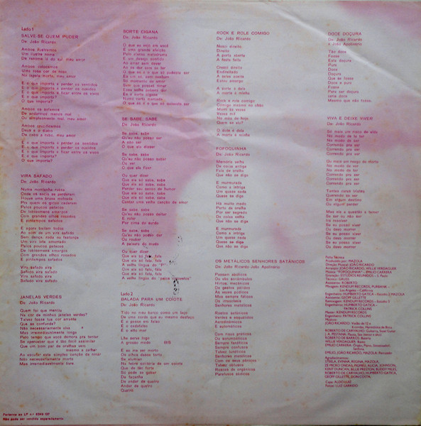 Como o belo texto do Marcelo resgata, João atira para todos os lados, tendo uma referência a “Mona” em “Salve-se Quem Puder”, o rock cinquentista de “Rock e Role Comigo”, e o clima caribenho esquizóide de “Os Metálicos Senhores Satânicos”, delirante, para dizer o mínimo. E o que é “Fofoquinha”, que me remete muito aos melhores momentos de Lóki! com aquele piano lindaço. E falando em lindo, adoro o dedilhado do violão em “Sorte Cigana”, talvez a canção mais bonita do disco, e que já indica os caminhos que João iria seguir com o Secos & Molhados no excelente disco de 78 (que baita instrumental)