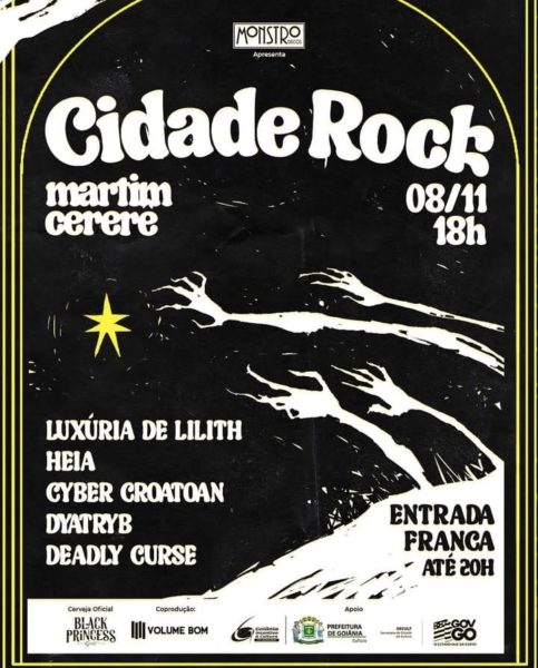 A HÉIA, um dos principais nomes do Black Metal sul-americano, já tem data marcada para retornar aos palcos da capital goiana. A banda foi confirmada ao lado dos grupos Luxúria De Lillith, Cyber Croatoan, Dyatryb e Deadly Curse no festival ‘Cidade Rock’. O evento, organizado pelo renomado selo/produtora Monstro Discos (@monstrodiscos), acontecerá no dia 08 de novembro de 2025 (sábado), a partir das 18 horas, no Centro Cultural Martim Cererê, em Goiânia/GO. Confira abaixo serviço completo para mais informações: