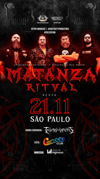 O Matanza Ritual se apresenta pela primeira vez no palco do Carioca Club, em São Paulo, no dia 21 de novembro, a partir das 20h, com show de lançamento do seu primeiro álbum, A Vingança é Meu Motor, lançado em março deste ano pela gravadora Deck.  Na ocasião, a banda apresentará músicas que fizeram sucesso com a voz de Jimmy London no Matanza. Ingressos à venda no site do Clube do Ingresso ou na bilheteria do Carioca Club. O evento terá abertura da banda Throw me to the Wolves. Desde sua formação em 2019, a banda percorreu o Brasil com shows lotados, apresentando clássicos do Matanza e singles como “Rei Morto” e “Morte Súbita”.