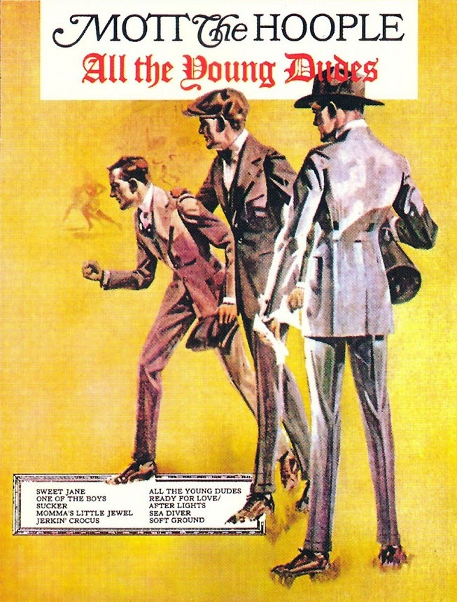 Marcello: O Mott The Hoople lançara quatro bons discos pelo selo Island sem fazer sucesso, e no começo de 1972 decidiu encerrar a carreira. Mas a banda contava com um fã que tinha se tornado poderoso na cena musical: David Bowie. Ele convenceu os rapazes (Ian Hunter, vocal, guitarra e piano; Mick Ralphs, guitarra, vocal; Pete Overend Watts, baixo, vocal; Verden Allen, órgão, sintetizador, vocais; Dale “Buffin” Griffin, bateria) a continuarem, deu-lhes uma música inédita, descolou um contrato com a CBS e ainda produziu o disco. E o resultado foi um dos melhores álbuns da banda: a versão (muito superior à original) de “Sweet Jane”, de Lou Reed, abre os trabalhos com grande qualidade; a segunda cover, a faixa-título, é indubitavelmente superior às versões ao vivo que Bowie gravaria nos anos seguintes; dois hard rocks mais próximos do começo da carreira da banda, “Jerkin’ Crocus” e “One of the Boys” (essa com uma longa coda feita especialmente para a banda – e Hunter – voar alto nos shows), mostram que o Mott The Hoople não perdia sua energia original. “Sucker” é divertida, “Momma’s Little Jewel” e “Soft Ground” (com vocal entusiasmado de Allen) são um pouco aquém das anteriores, mas de modo algum são músicas ruins. Claro, há também a maravilhosa “Ready for Love” (apaixonadamente cantada pelo seu autor Mick Ralphs e com o sax de Bowie dando umas floreadas) perde um pouco para a versão fantástica do Bad Co., mas neste álbum deve ter feito muito fã se emocionar; a coda instrumental, intitulada “After Lights”, é belíssima e poderia ter sido lançada como faixa independente. A coisa toda se encerra com “Sea Diver”, bonita balada que traz o melhor desempenho de Ian Hunter em todo o disco. Após esse disco, Verden Allen deixou a banda, que gravou seu sexto álbum (simplesmente intitulado Mott) como quarteto (e atingiu o 7º lugar na parada britânica, contra o 21º de All the Young Dudes), e, em 1974, lançaria The Hoople, com Ariel Bender no lugar de Ralphs, e Live, seu disco mais bem-sucedido nos EUA (23º posto na Billboard), após o qual Hunter saiu. O grupo ainda tentou continuar, e eventualmente se reuniria para shows, mas nunca superou All The Young Dudes.