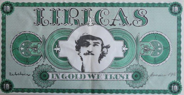 Essa instabilidade não se limita à capa. Na contracapa, um desenho do próprio Belchior, também intitulado Alucinação, amplia essa dimensão autoral, como se o disco se recusasse a separar som e imagem. Já no encarte, a montagem gráfica que remete a uma cédula de dólar – com o trocadilho “in gold we trust”, que reescreve o lema “in God we trust” ao trocar Deus pelo ouro, deslocando a ideia de fé para o campo do valor e da materialidade – introduz um deslocamento simbólico mais direto: a substituição do sagrado pelo valor, da crença pela materialidade – como se, a partir daí, já não houvesse para onde recuar. Nada disso é casual. Ao contrário, forma um campo de leitura que antecede a audição e a orienta. Porque, antes mesmo de qualquer canção, Alucinação já se apresenta como um espaço de tensão: entre identidade e deslocamento, entre experiência e representação, entre aquilo que se vê e aquilo que se vive. A capa, o encarte e a contracapa não apenas ilustram o disco: eles participam da mesma operação que as canções irão aprofundar, como se, já ali, o disco indicasse que a experiência que ele propõe não se ancora mais em expectativas, mas no confronto direto com o real. Ouvir a música com a capa em mãos era parte de um ritual hoje praticamente extinto, e que Belchior, já ali, parecia compreender como parte inseparável da experiência do disco.