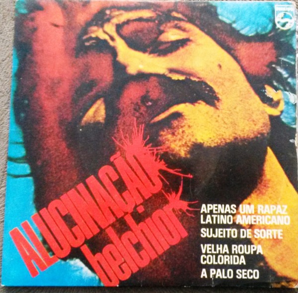O encontro com Elis Regina, no auge de sua fama em 1975, não só é parte dessa trajetória como o legitima e, mais do que isso, torna-o visível. Ao levar “Como Nossos Pais” e “Velha Roupa Colorida” para o centro da música brasileira, no espetáculo Falso Brilhante, Elis amplia o alcance daquelas canções, que se tornam sucessos e hinos instantâneos de nosso país. Ouvi-las nas primorosas versões do espetáculo de Elis expõe um descompasso decisivo entre duas formas de abordar a mesma canção: se, na sua interpretação, elas ganham acabamento, projeção e uma forma definitiva e universal, na voz de Belchior elas permanecem em estado de tensão: mais ásperas, mais diretas, mais pessoais e, certamente por isso, integradas ao que o disco viria a formular com mais nitidez. E é justamente nessa diferença que se começa a delinear o que Alucinação viria a consolidar: não apenas um repertório, mas a formulação de um sujeito – esse rapaz latino-americano que se constrói na experiência do desterro, feita de deslocamentos, confrontos e tentativas de permanência em uma cidade (ou mesmo um mundo) que insiste em não o identificar como um dos seus. Há nos versos algo de crônica, algo de literatura, algo de jornalismo. Por isso que, nas canções de Alucinação, acompanhamos a experiência de quem atravessa a cidade, reconfigura sua própria existência e aprende que a realidade pode ser tão vertiginosa quanto a sensação que se percebe na arte da capa do LP.