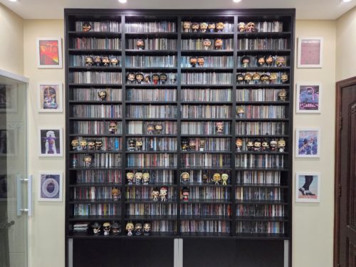 Um detalhe dessa coleção é que eu só compro peças de artistas de que realmente gosto ou de quem eu tenha ao menos um disco na prateleira. Até então, eles ficavam misturados aos Funkos de filmes e séries, mas, quando fiz o projeto da estante que aparece nas fotos, tive a ideia de mandar fazer prateleiras com um espaço maior para posicionar cada um deles junto aos CDs, em frente à sua respectiva discografia.